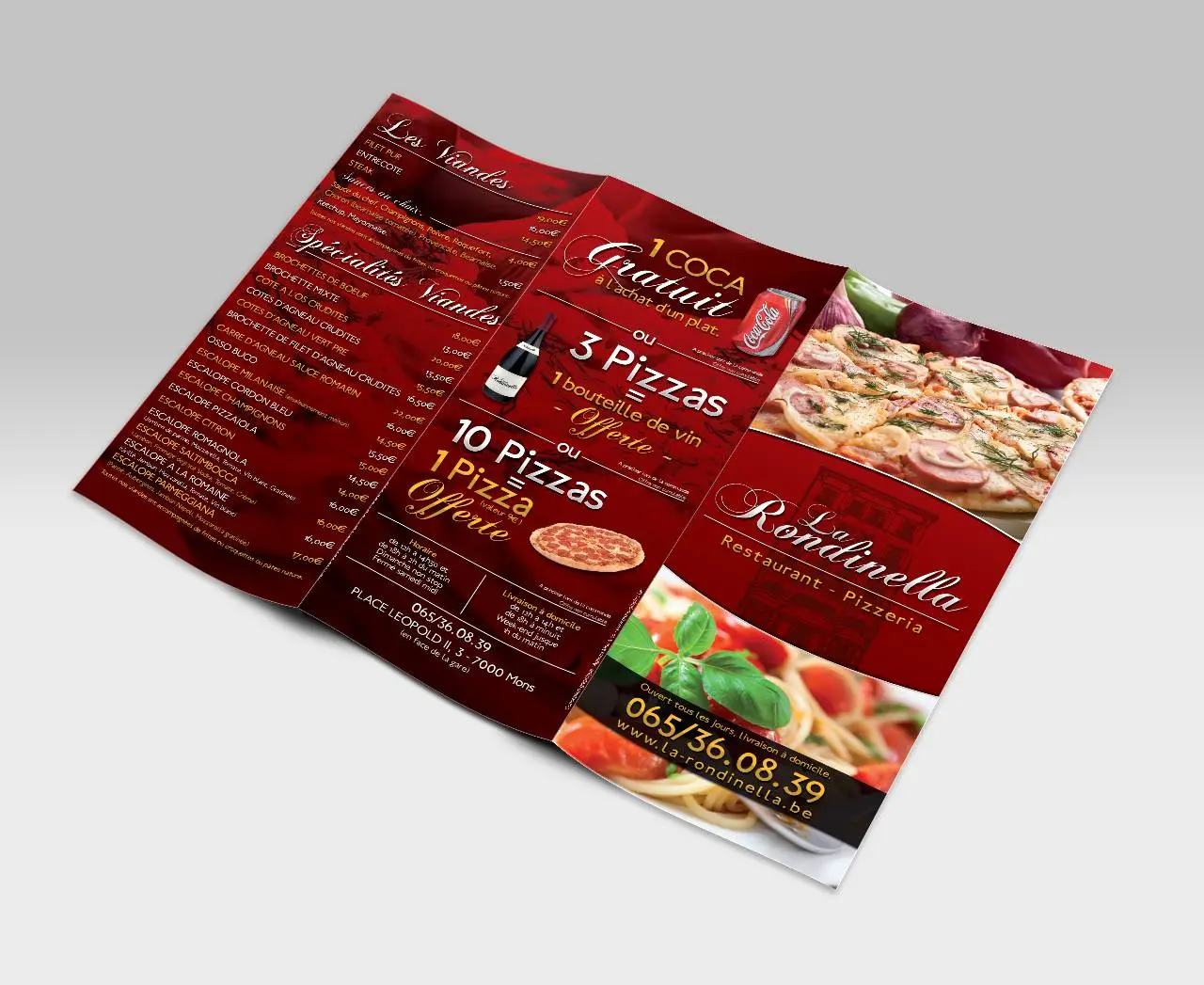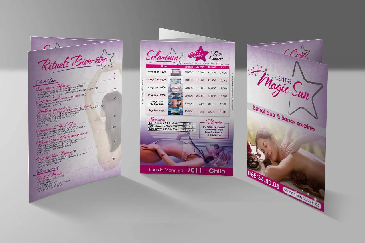 Nos dépliants, qu’ils soient diptyques (2 volets), triptyques (3 volets) ou tétraptyques (4 volets) sont bien plus complets que les flyers car ils peuvent contenir beaucoup plus d’informations. Ils vous permettront non seulement de faire la publicité d’un produit ou d’une promotion mais de faire connaître également votre société ainsi que ses activités et de mettre en valeur vos atouts.